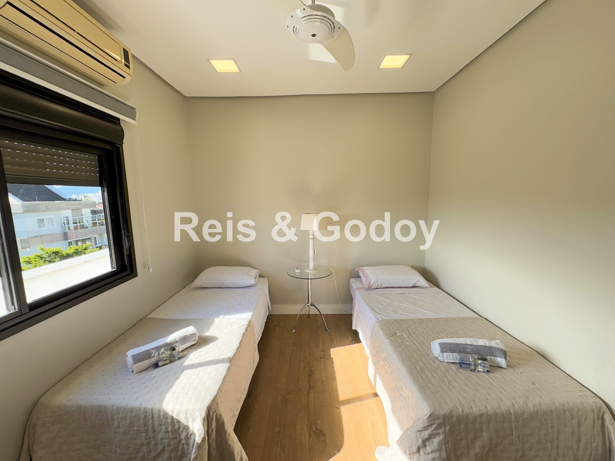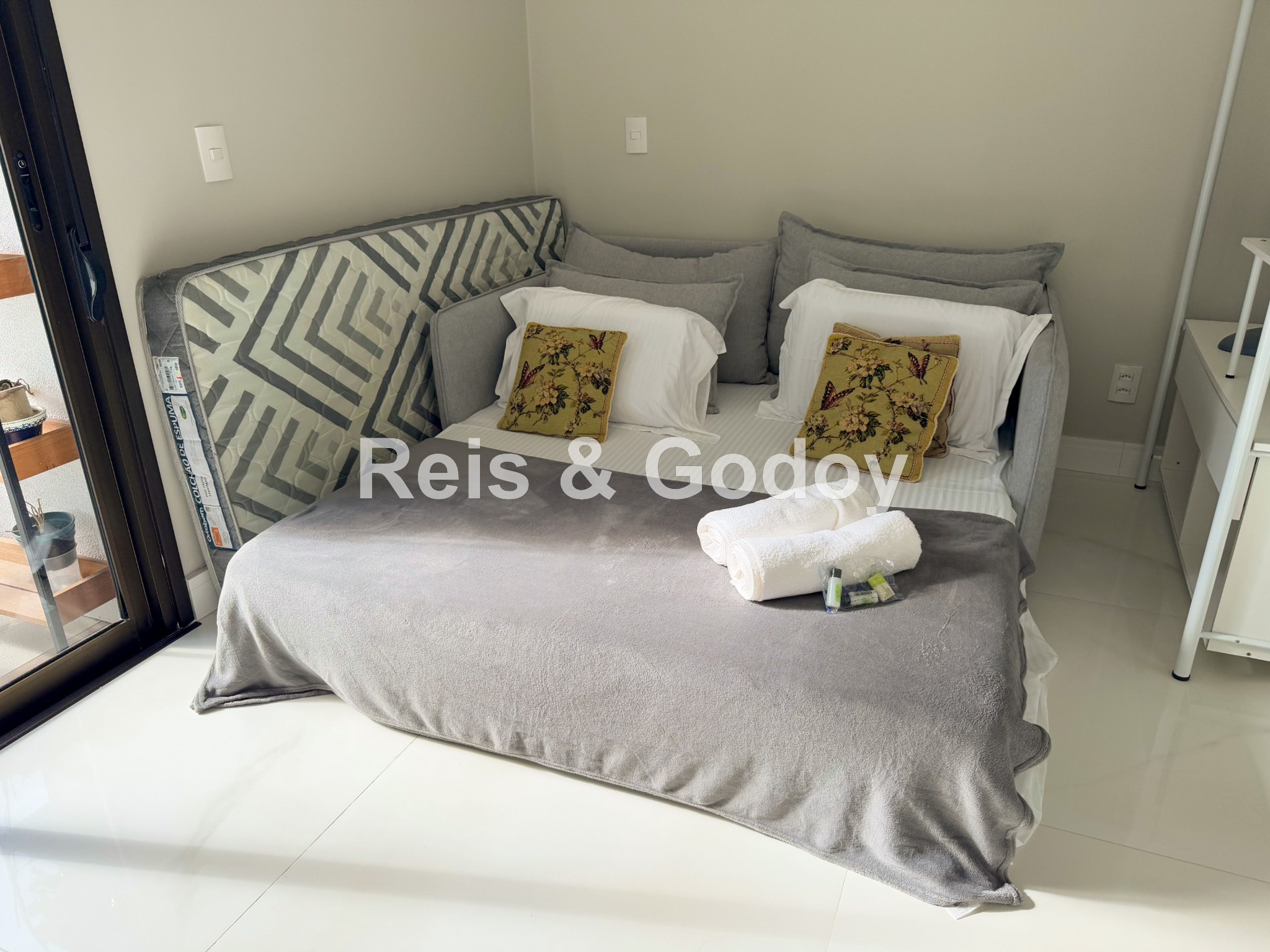 Disposição das camas: 1 cama de casal, 2 camas de solteiro e 1 sofá cama de casal.