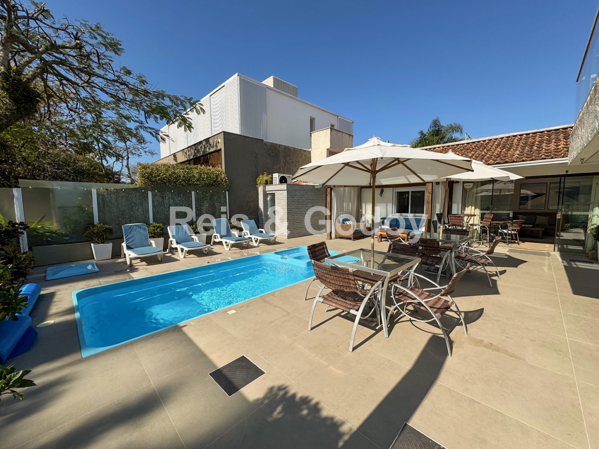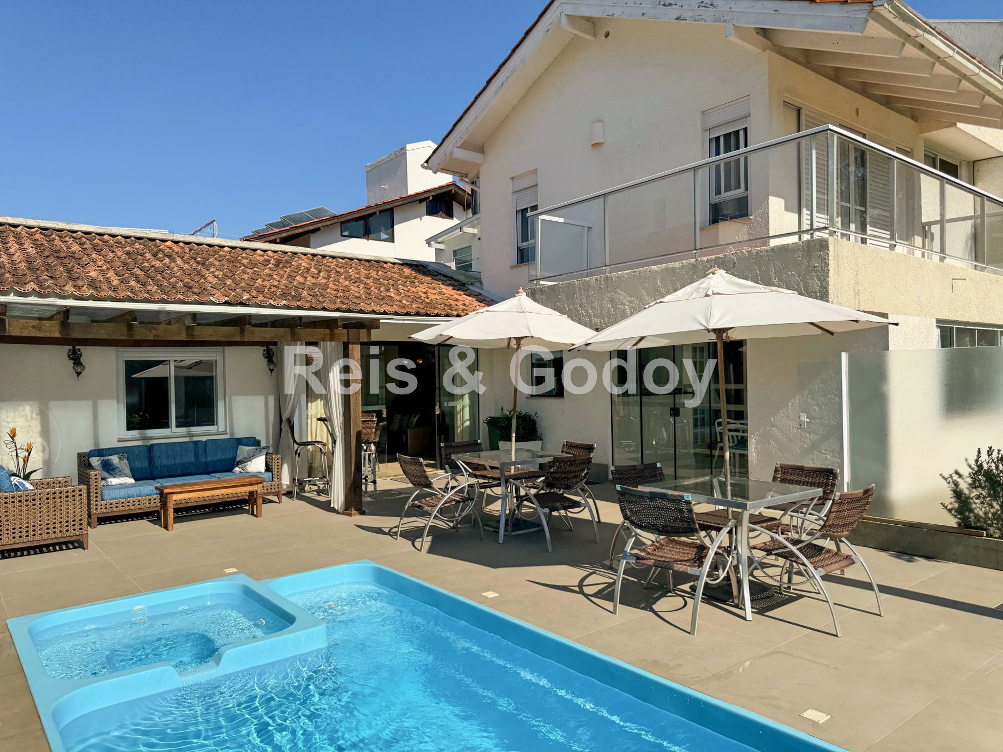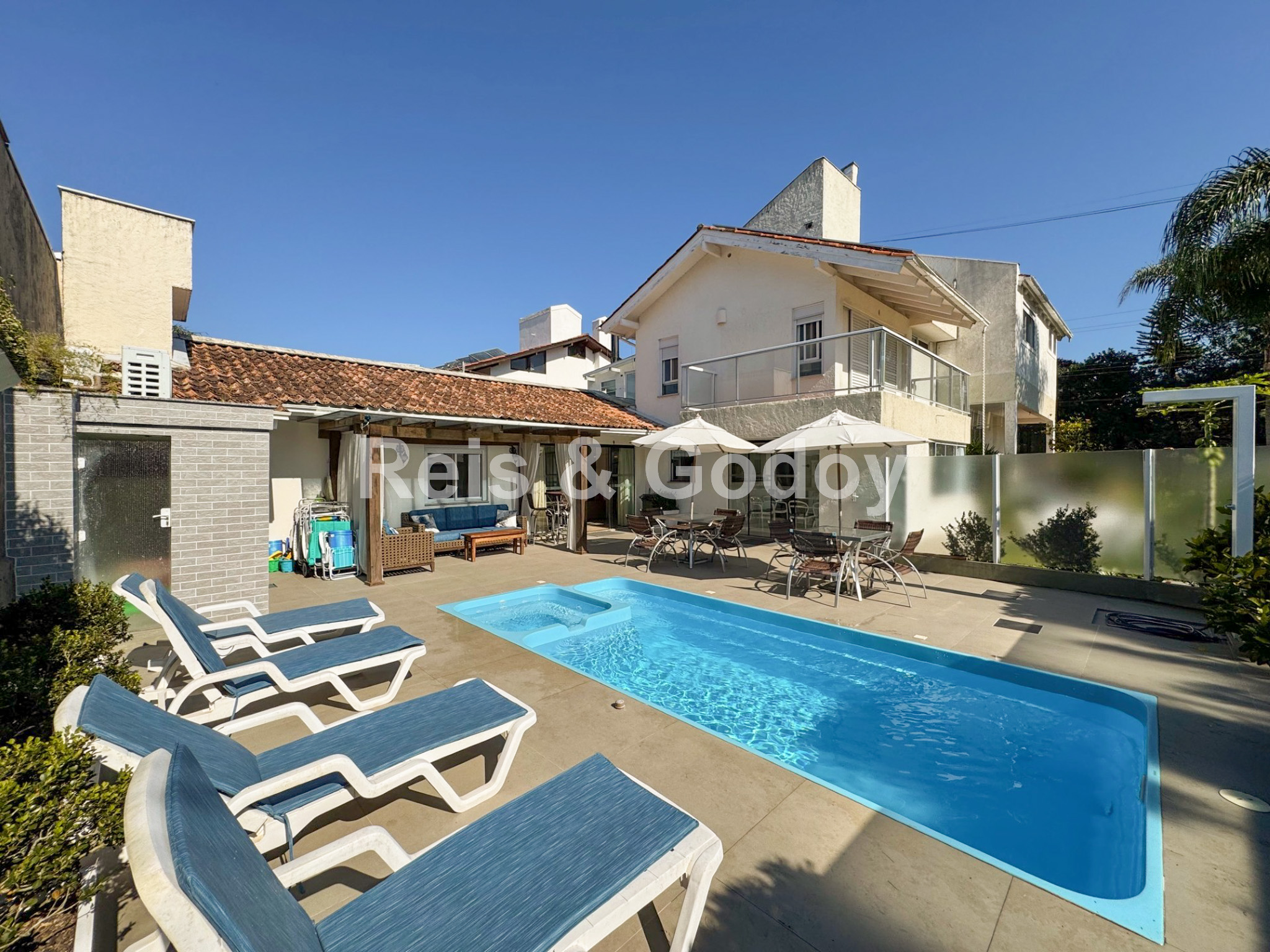 Com certeza uma das casas mais completas de Jurerê Internacional !! Excelente casa com 5 suítes, 9 ar condicionados Split (todos os ambiente e suítes), aquecimento solar, piscina, churrasqueira, Internet WIFI alta velocidade, TV a cabo, TVs em todas as suítes, cozinha completa, geladeira, freezer, máquina de lavar roupa, máquina de secar roupa, máquina de lavar louça e 2 vagas de garagem. Localização excelente a 350m da praia em frente a área verde.