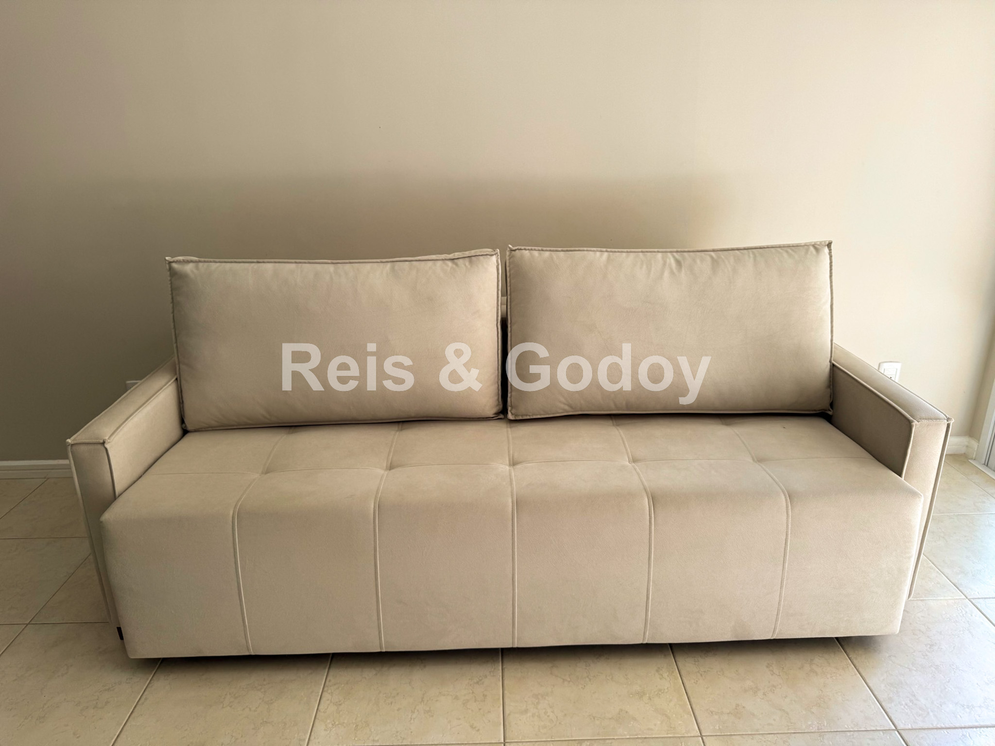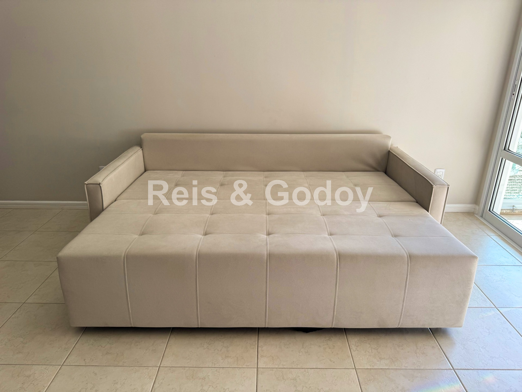 Disposição das camas: 2 camas de casal e 1 sofá cama de casal.
