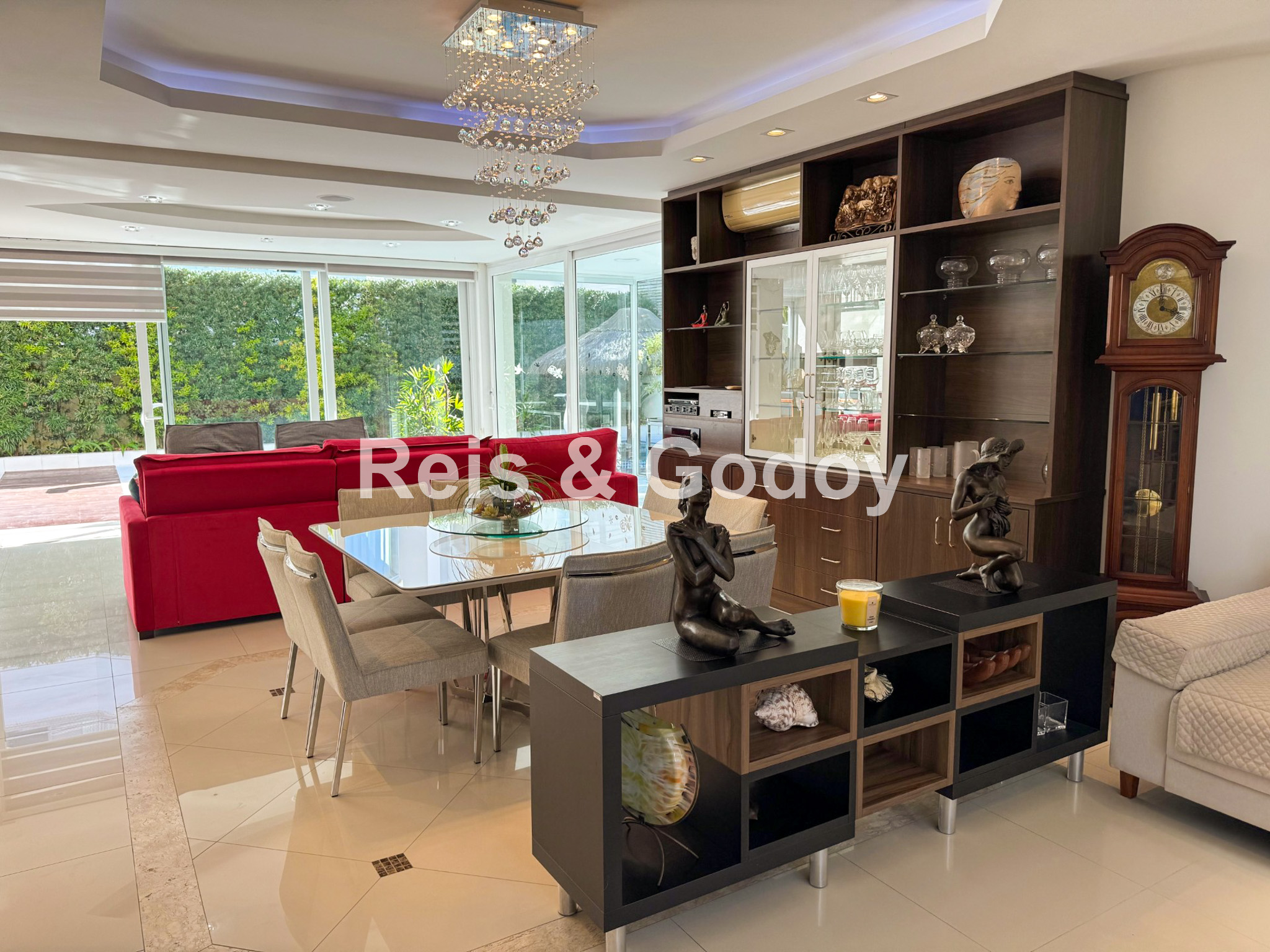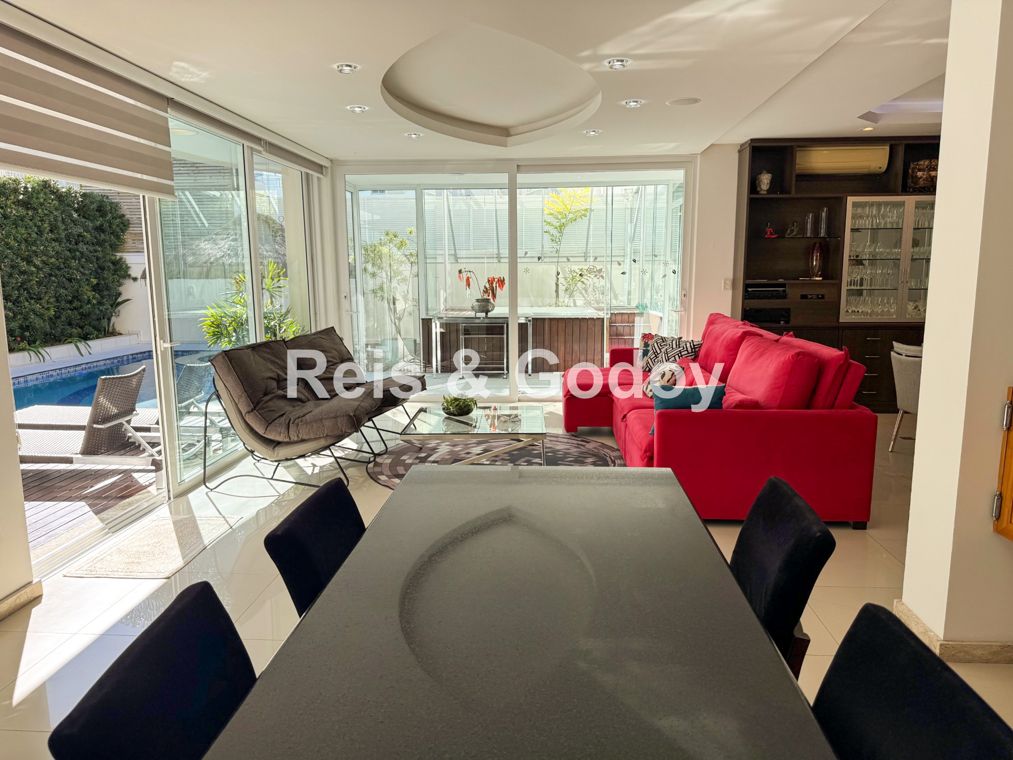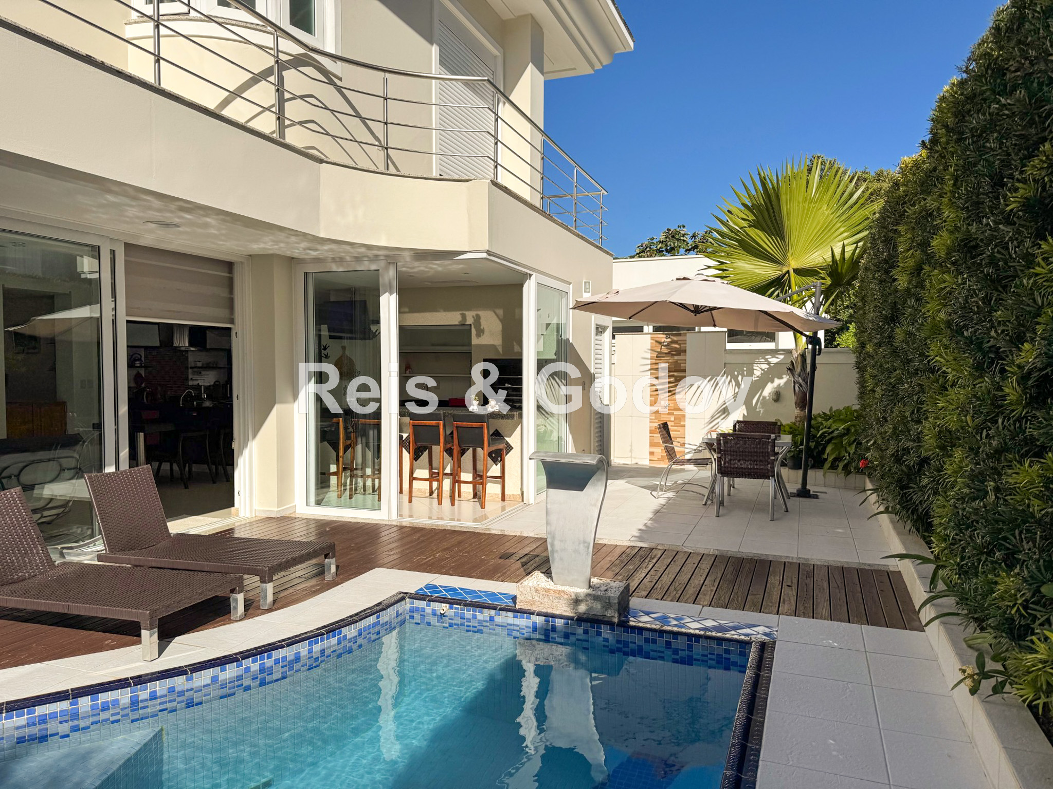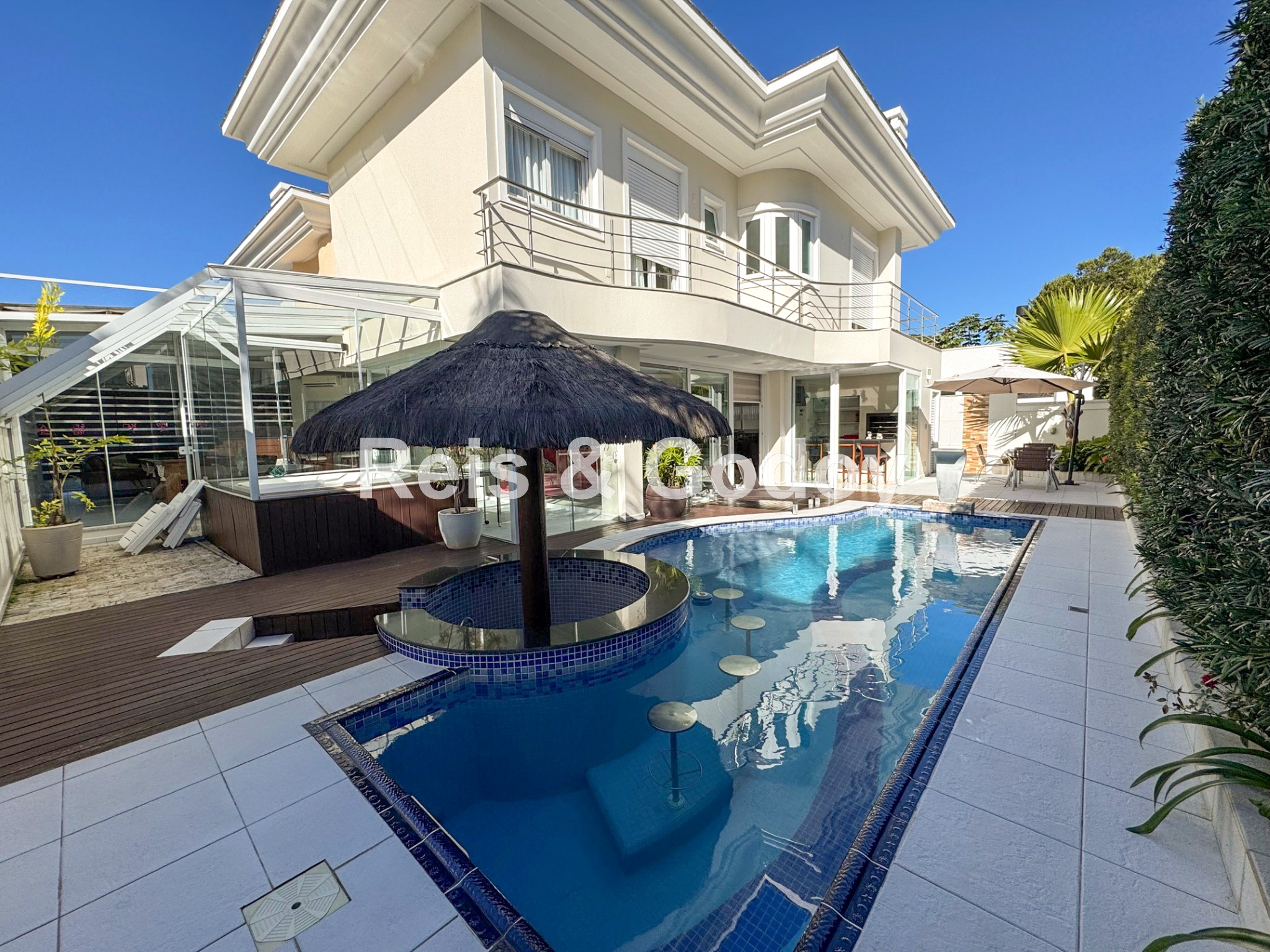 Melhor área de lazer de Jurere Internacional. Linda mansão com 4 suítes (sendo uma no térreo), ar condicionado split em todos os ambientes, área de lazer com piscina, bar molhado, cascata, hidromassagem aquecida e churrasqueira, sala de jogos com mesa de snooker, Internet WIFI, Smart TV, cozinha completa, máquina de lavar roupa, máquina de secar roupa, 2 vagas de garagem e excelente localização em rua tranquila de Jurere Internacional.