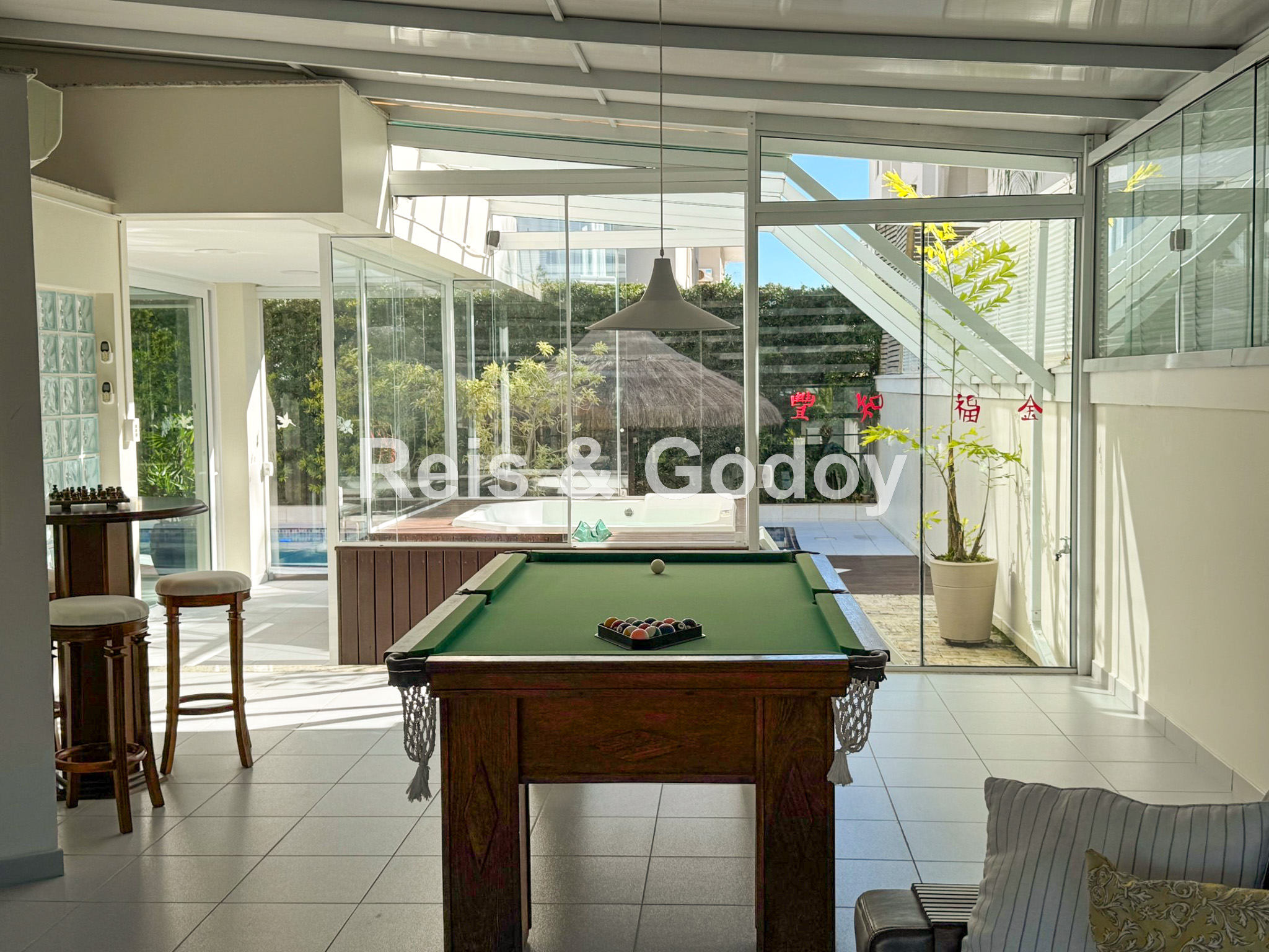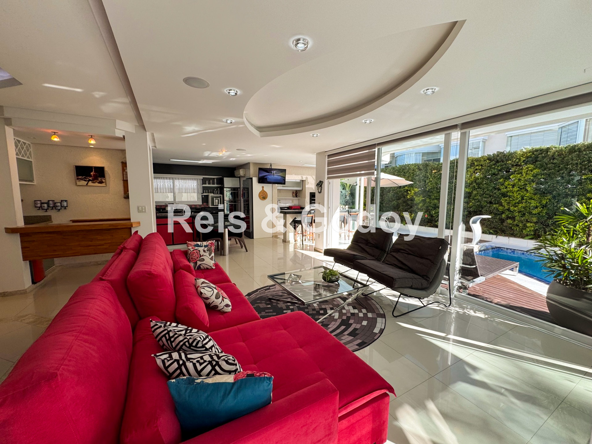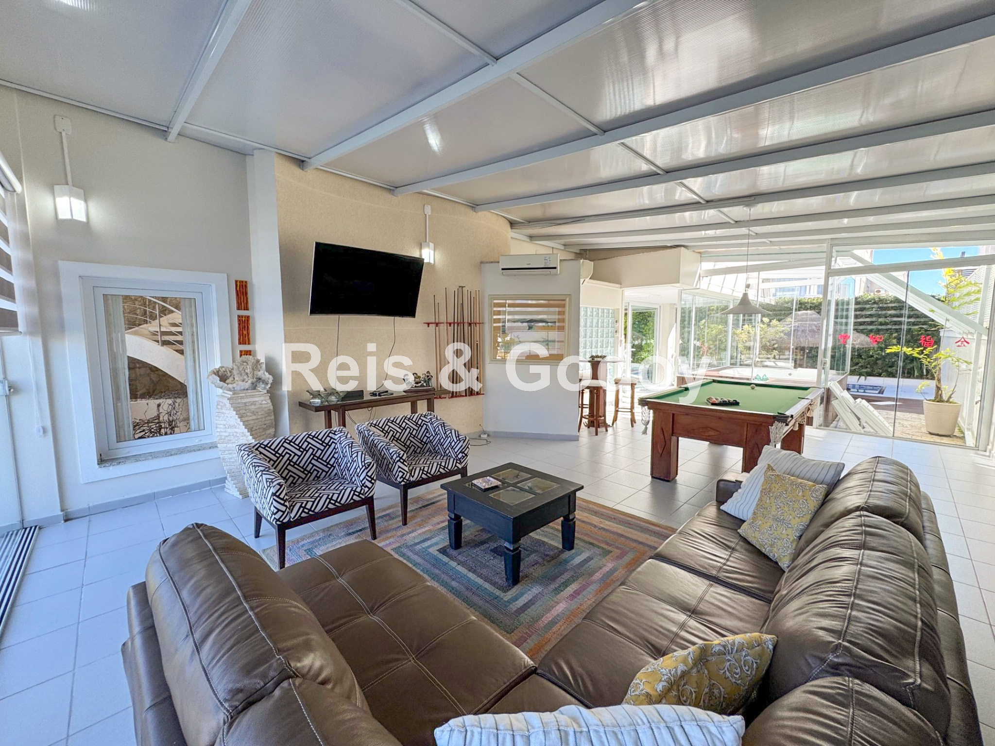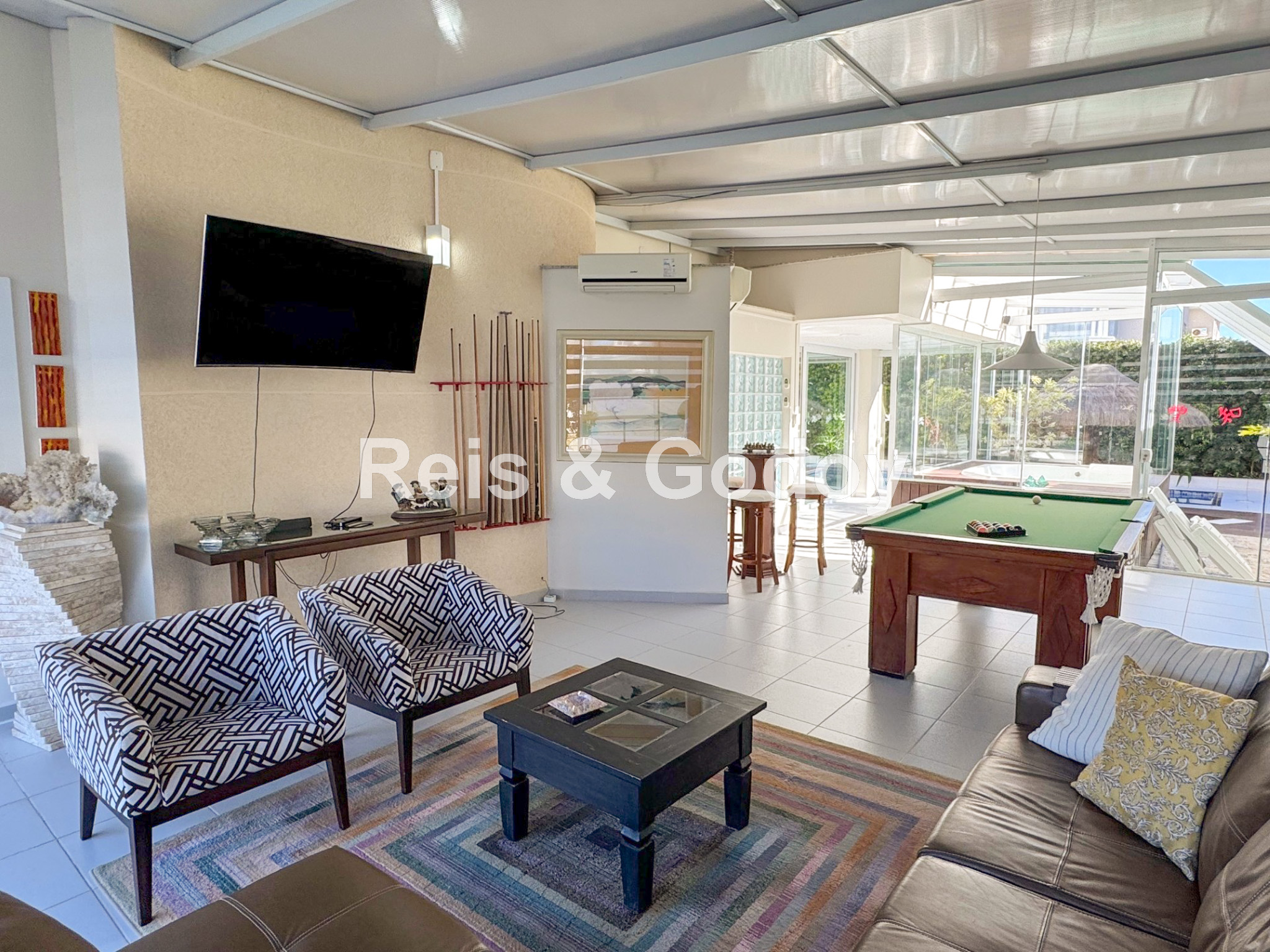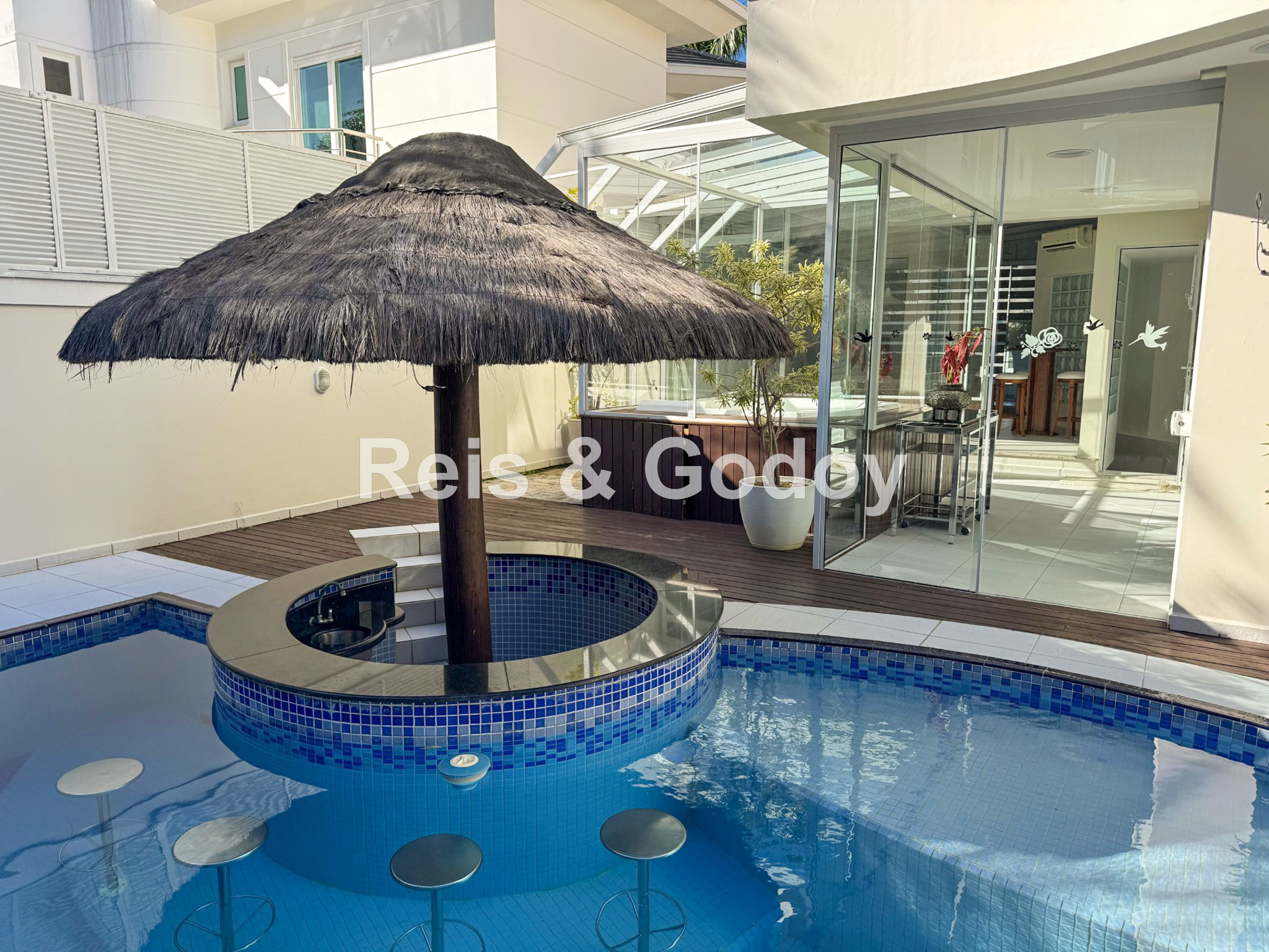 Melhor área de lazer de Jurere Internacional. Linda mansão com 4 suítes (sendo uma no térreo), ar condicionado split em todos os ambientes, área de lazer com piscina, bar molhado, cascata, hidromassagem aquecida e churrasqueira, sala de jogos com mesa de snooker, Internet WIFI, Smart TV, cozinha completa, máquina de lavar roupa, máquina de secar roupa, 2 vagas de garagem e excelente localização em rua tranquila de Jurere Internacional.