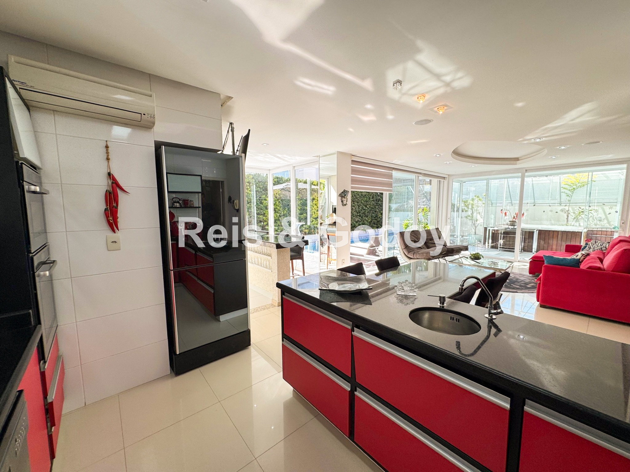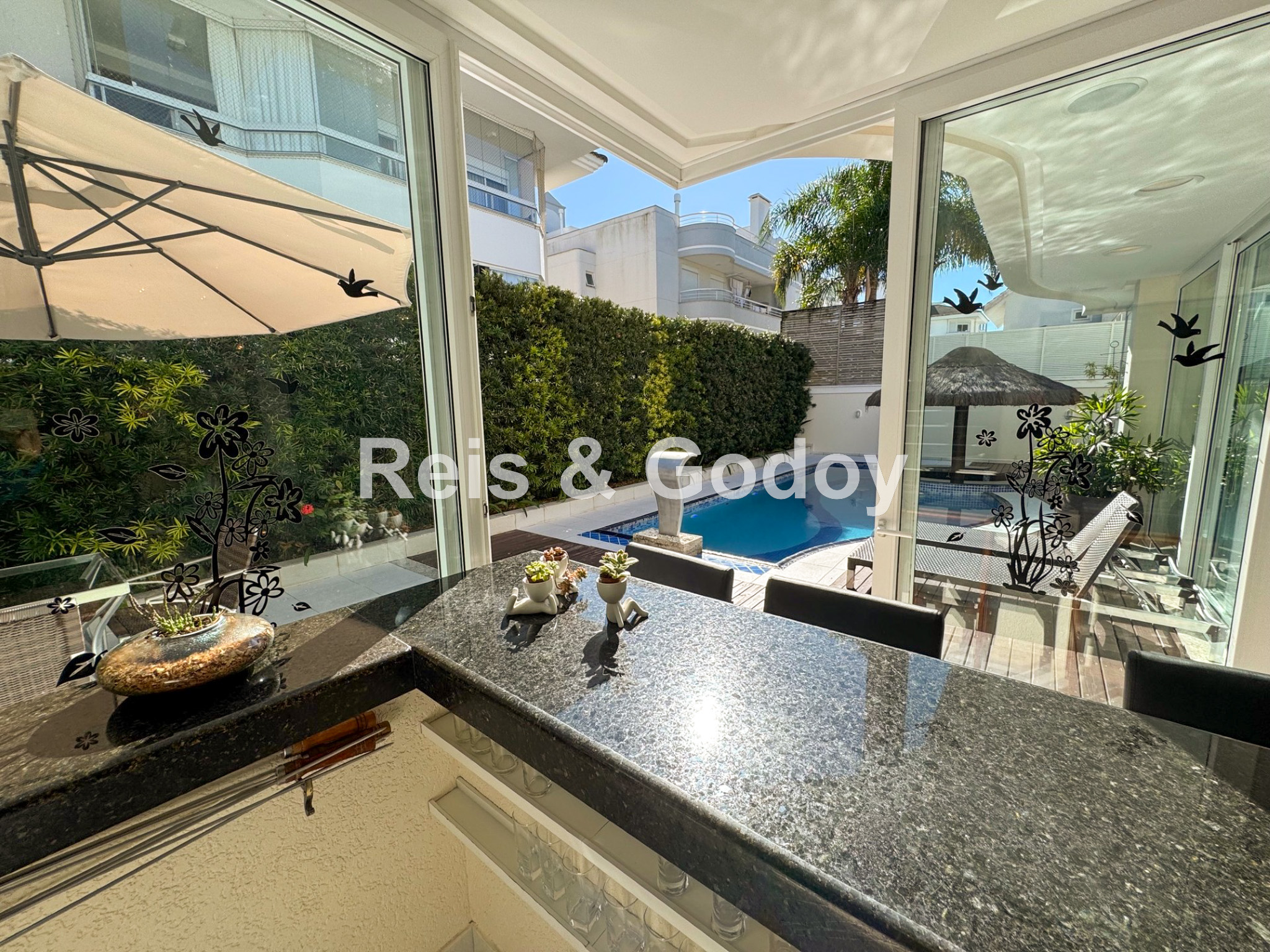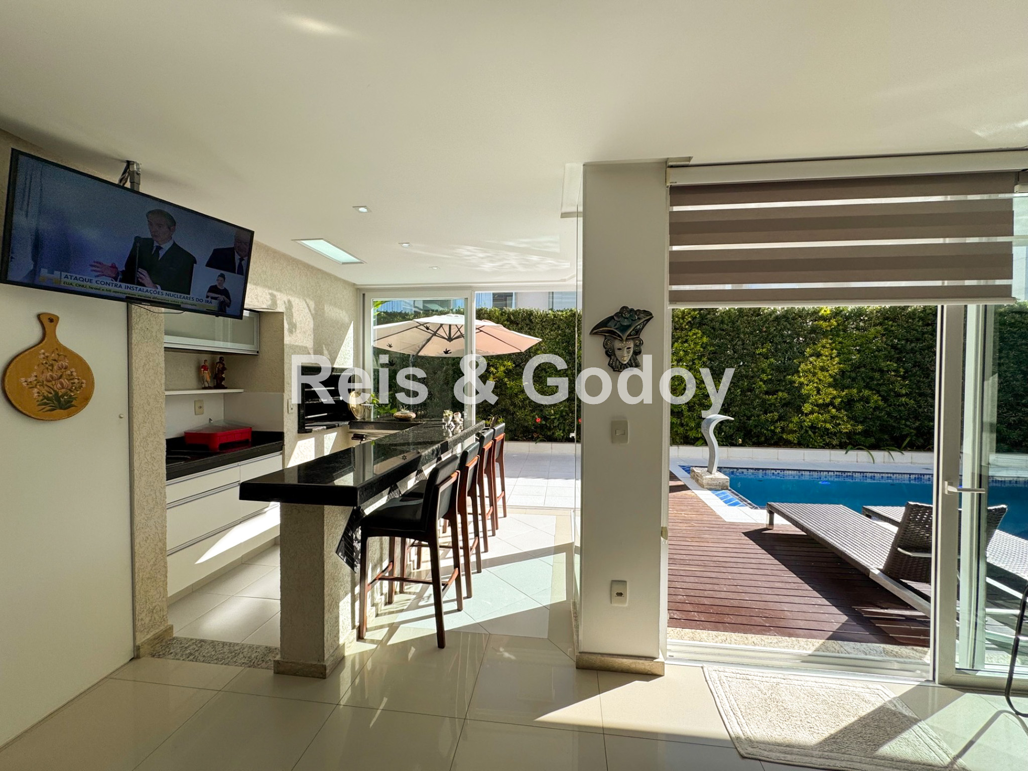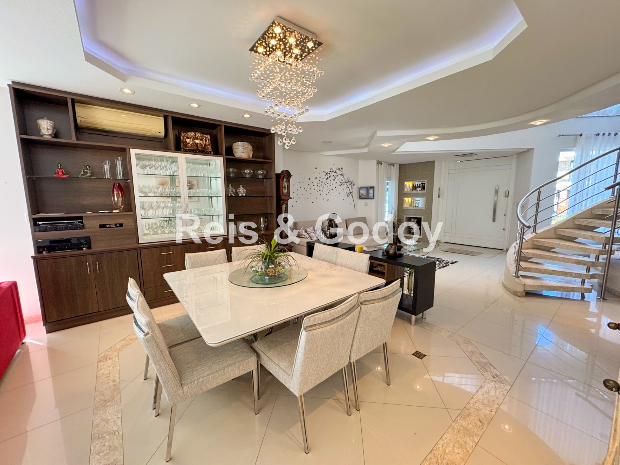 Melhor área de lazer de Jurere Internacional. Linda mansão com 4 suítes (sendo uma no térreo), ar condicionado split em todos os ambientes, área de lazer com piscina, bar molhado, cascata, hidromassagem aquecida e churrasqueira, sala de jogos com mesa de snooker, Internet WIFI, Smart TV, cozinha completa, máquina de lavar roupa, máquina de secar roupa, 2 vagas de garagem e excelente localização em rua tranquila de Jurere Internacional.